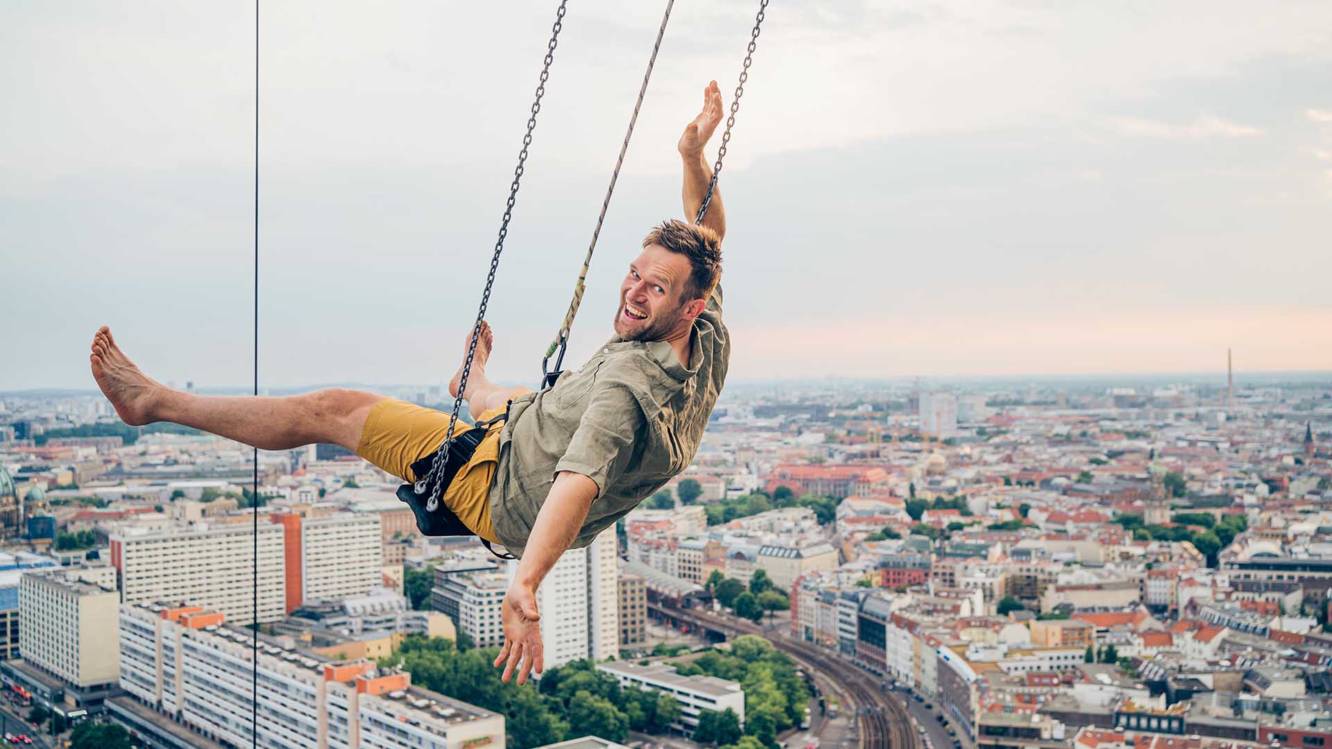 Dann beginnt dein Abenteuer. Für die nächsten 5 Minuten genießt du unseren High Swing und erlebst die absolute Freiheit über den Dächern Berlins – nur der Fernsehturm überragt dich!