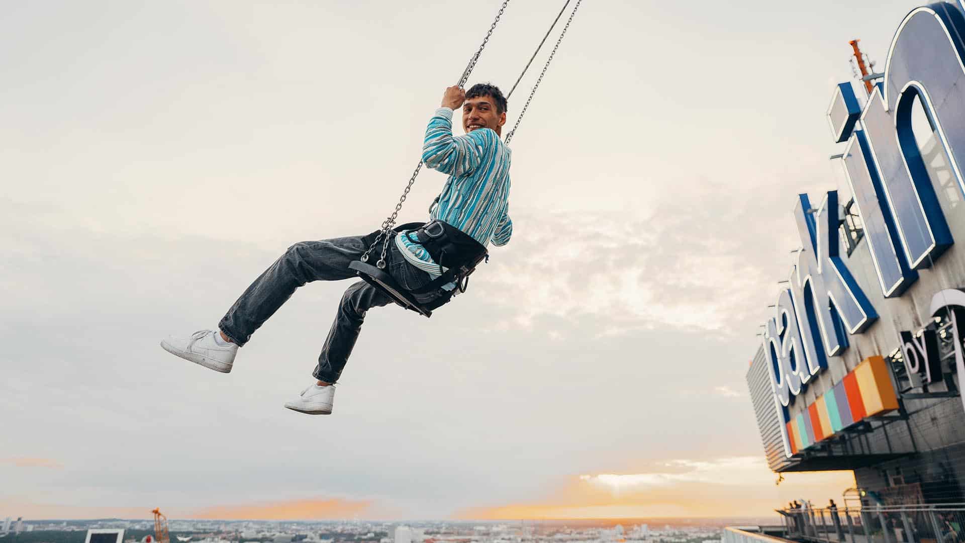 Die ultimative Schaukel für Adrenalinfans: Schwinge dich 120 Meter über die Kante des Park Inn Hotels und genieße den atemberaubenden Ausblick über Berlin. Währenddessen kann deine Begleitung einmalige Fotos von dir schießen.